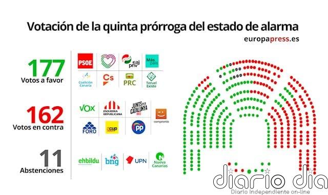 El Pleno del Congreso ha aprobado este miércoles la quinta prórroga del estado de alarma decretado por el Gobierno por la pandemia del coronavirus, que llevará las restricciones hasta las cero horas el próximo 7 de junio. Aunque ha alcanzado justo la mayoría absoluta, sumando 177 votos, esta nueva ampliación ha encontrado más oposición que nunca pues el PP se ha pasado al ‘bloque del No’, donde ya estaban Vox y los independentistas de ERC y Junts, entre otros.
