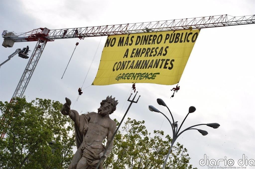 Escaladores de Greenpeace han desplegado una pancarta en la plaza de Neptuno de Madrid, próxima al Congreso de los Diputados, para exigir que no se destine más dinero público a empresas contaminantes. La acción se ha llevado a cabo coincidiendo con el día en el que el Gobierno tiene previsto aprobar las nuevas ayudas a la compra de automóviles.