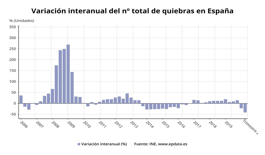 Las familias y empresas que se declararon en concurso de acreedores (suspensión de pagos y quiebras) ante la imposibilidad de afrontar sus pagos y deudas bajaron un 41,3% en el segundo trimestre de este año respecto al mismo periodo de 2019, hasta sumar 1.111, según la Estadística de Procedimiento Concursal del Instituto Nacional de Estadística (INE) publicada este miércoles.