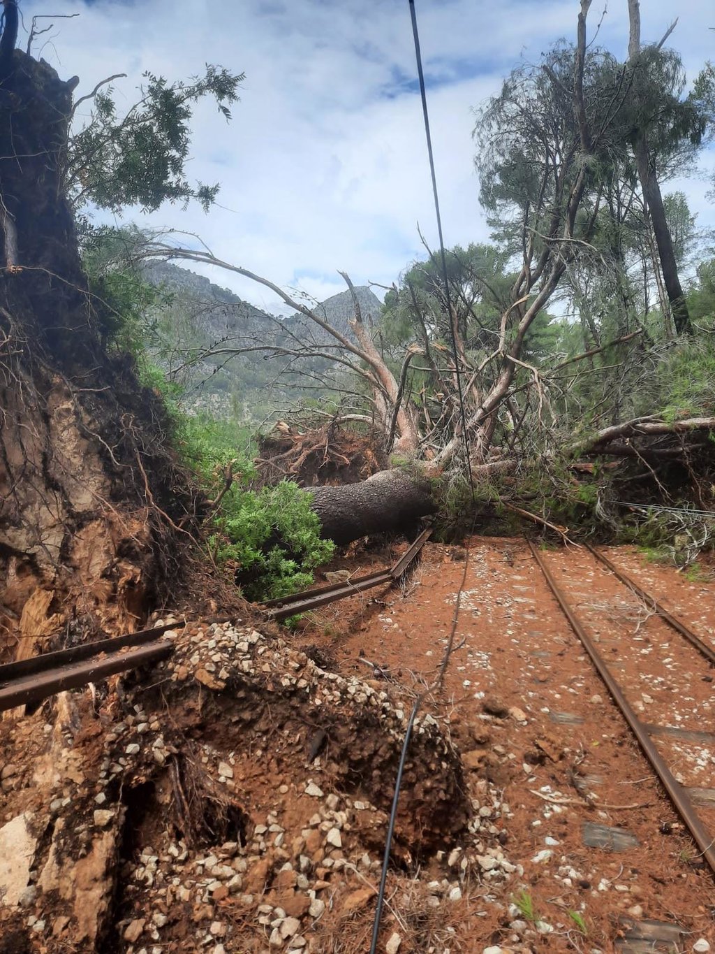 Así pues, según los ingenieros de Ferrocaril de Sóller, la tormenta dejó más de una docena de árboles arrancados de raíz o partidos por la mitad, así como diferentes ramas que, a su caída, causaron averías.