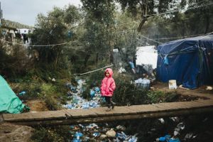 Una niña solicitante de asilo de Afganistán camina sobre un puente precario dentro de lo que se conoce como El Olivar, un campamento improvisado adyacente al centro de recepción e identificación de Moria en la isla griega de Lesbos. Foto: Achilleas Zavallis/Acnur