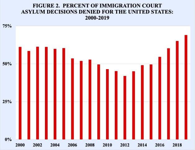 Porcentaje de decisiones de asilo de los tribunales de inmigración denegatorias para Estados Unidos: 2000-2019. Fuente: TRAC Immigration