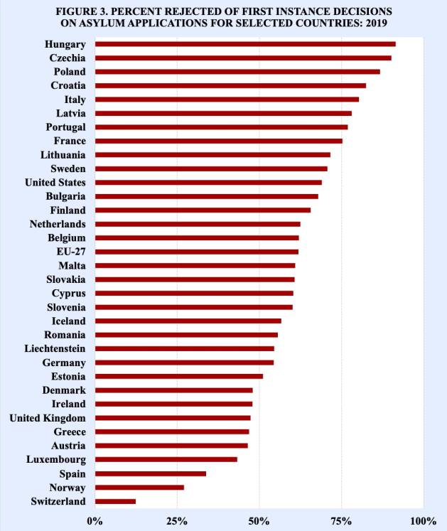 Porcentaje de decisiones de primera instancia que rechazaron solicitudes de asilo para países seleccionados: 2019. Hungría, República Checa, Polonia, Croacia, Italia, Letonia, Portugal, Francia, Lituania, Suecia, Estados Unidos, Bulgaria, Finlandia, Países Bajos, Bélgica, Países de la Unión Europea, Malta, Eslovaquia, Chipre, Eslovenia, Islandia, Rumania, Liechtenstein, Alemania, Estonia, Dinamarca, Irlanda, Reino Unido, Grecia, Austria, Luxemburgo, España, Noruega, Suiza. Fuente: Eurostat y TRAC Immigration