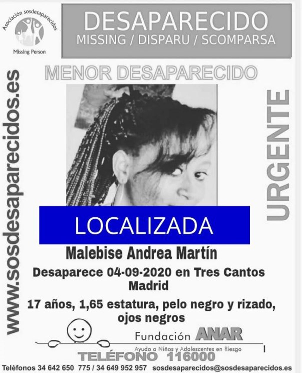 Según ha informado la Guardia Civil en redes sociales, Malebise Andrea M., de 17 años y cuyo rastro se había perdido el pasado viernes 4 de septiembre en la localidad madrileña, ha aparecido en buen estado durante la tarde de este domingo.