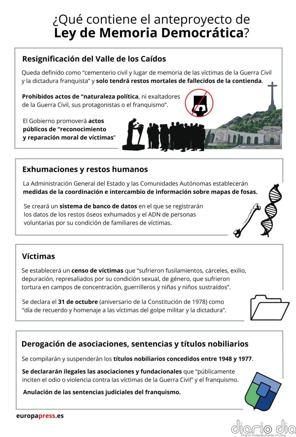 Entre las novedades de la ley, destinada fundamentalmente a exhumar, identificar y reparar a las víctimas, está la futura conmemoración de dos fechas: el 31 de octubre, fecha en que se aprobó el proyecto de Constitución española de 1978 en el Congreso de los Diputados y el 8 de mayo como efeméride para recordar a quienes lucharon contra el nazismo y el fascismo.