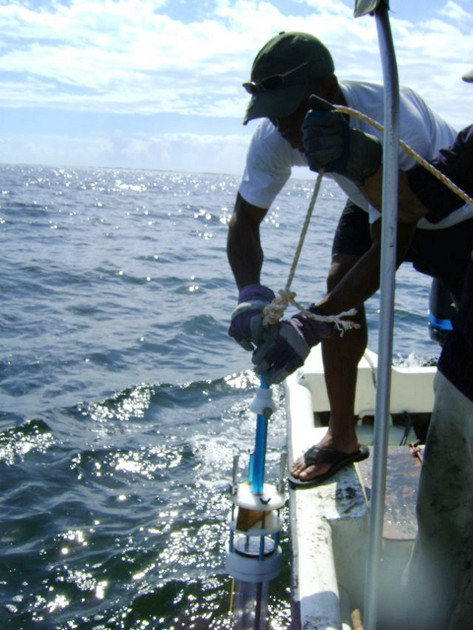 Recolección de muestra de sedimentos mediante un nucleador de gravedad en el Puerto de Kingston, Jamaica. Foto: Cortesía de Sheries Simpson