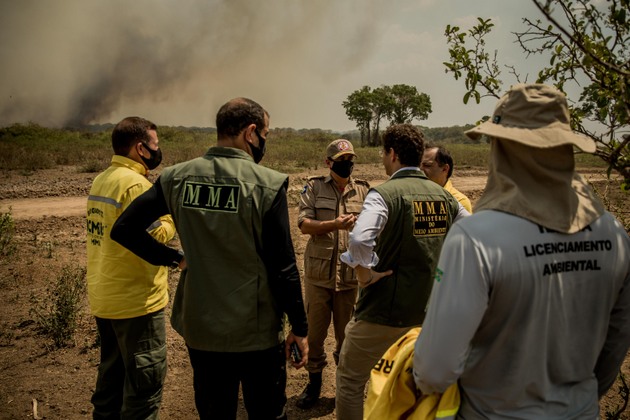 El ministro de Medio Ambiente, Ricardo Salles (al centro de espaldas), visita brigadas que combaten los incendios que ya destruyeron más de 20 por ciento de la vegetación del Pantanal, mayor humedal del mundo, que sufre la peor sequía de la historia y la consecuente propagación de las llamas. La mortandad de la fauna, numerosa y diversificada, agrava la tragedia en cuya prevención y mitigación poco hizo el ministro, más preocupado en desmantelar su cartera y las instituciones que de ella dependen. Foto: Christiano Antonucci/Secom-Fotos Públicas