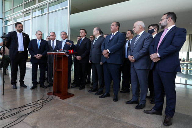 El ministro de Economía, el ultraliberal Paulo Guedes, con el presidente Jair Bolsonaro a su derecha, declara a los periodistas tras una ronda de negociaciones con legisladores sobre diferentes temas, incluido el proyectado programa Renta Brasil, de transferencias para millones de pobres, que contradice su compromiso de austeridad fiscal. Foto: Marcos Corrêa/PR-Fotos Públicas