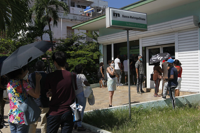 Clientes hacen fila en el exterior de una sucursal en La Habana del Banco Metropolitano, durante la tercera fase de enfrentamiento a la enfermedad de covid-19. La estrategia para la nueva normalidad prevé incentivar las importaciones y exportaciones de cooperativas y emprendedores privados, así como avanzar en cambios en el sistema tributario y facilitar trámites para obtener permisos. Foto: Jorge Luis Baños /IPS