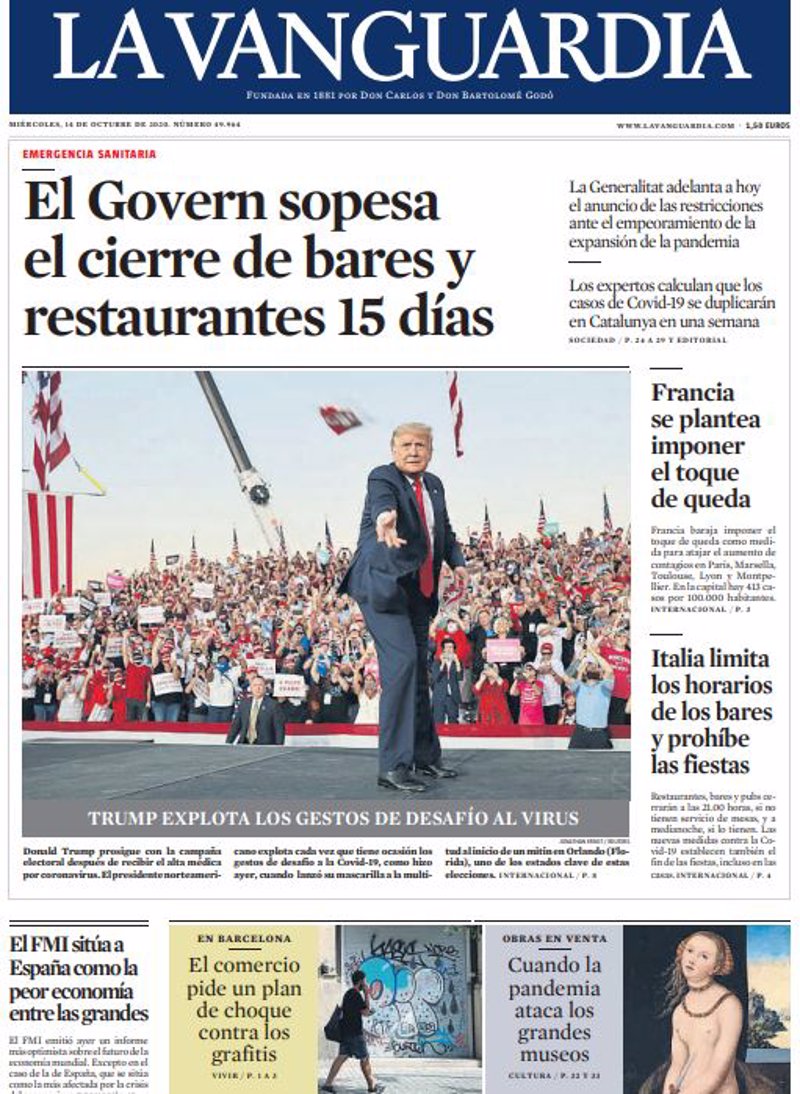 LA VANGUARDIA: «El Govern sopesa el cierre de bares y restaurantes 15 días»; «El FMI sitúa a España como la peor economía entre las grandes»; «Francia se plantea imponer el toque de queda»; «Italia limita los horarios de los bares y prohíbe las fiestas».