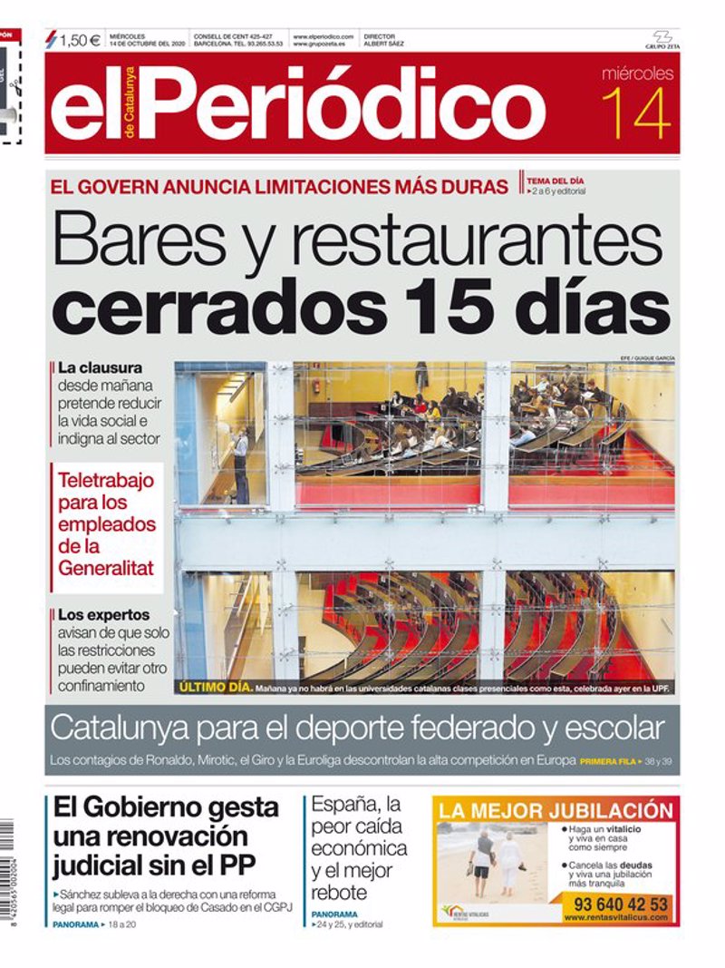 EL PERIÓDICO: «Bares y restaurantes cerrados 15 días»; «Teletrabajo para los empleados de la Generalitat»; «Cataluña para el deporte federado y escolar»; «El Gobierno gesta una renovación judicial sin el PP»; «España, la peor caída económica y el mejor rebote».