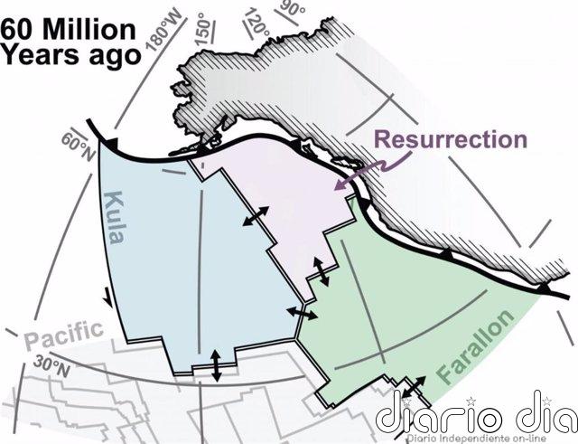Esta imagen muestra la reconstrucción de placas tectónicas del oeste de América del Norte hace 60 millones de años que muestra la subducción de tres placas tectónicas clave, Kula, Farallon y Resurrection.