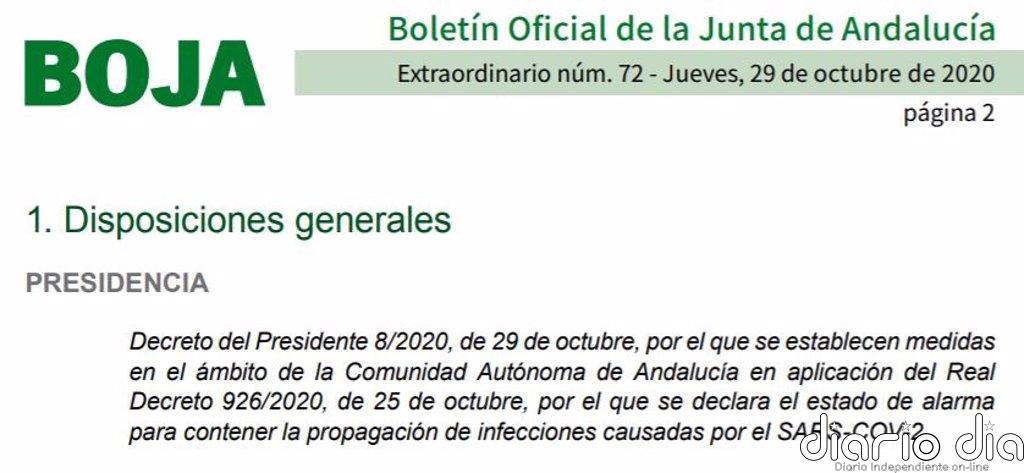 El Boletín Oficial de la Junta de Andalucía (BOJA) ha publicado poco antes de las 23 horas de este jueves una edición extraordinaria con un decreto del presidente, Juanma Moreno, sobre medidas en aplicación del estado de alarma para contener la propagación de infecciones causadas por el SARS-COV-2 que regula el cierre perimetral de la comunidad y el confinamiento de más de 4,5 millones de habitantes de 449 municipios de las provincias de Cádiz, Córdoba, Granada, Jaén, Málaga y Sevilla desde las 00.00 horas de este viernes y hasta el próximo 9 de noviembre.