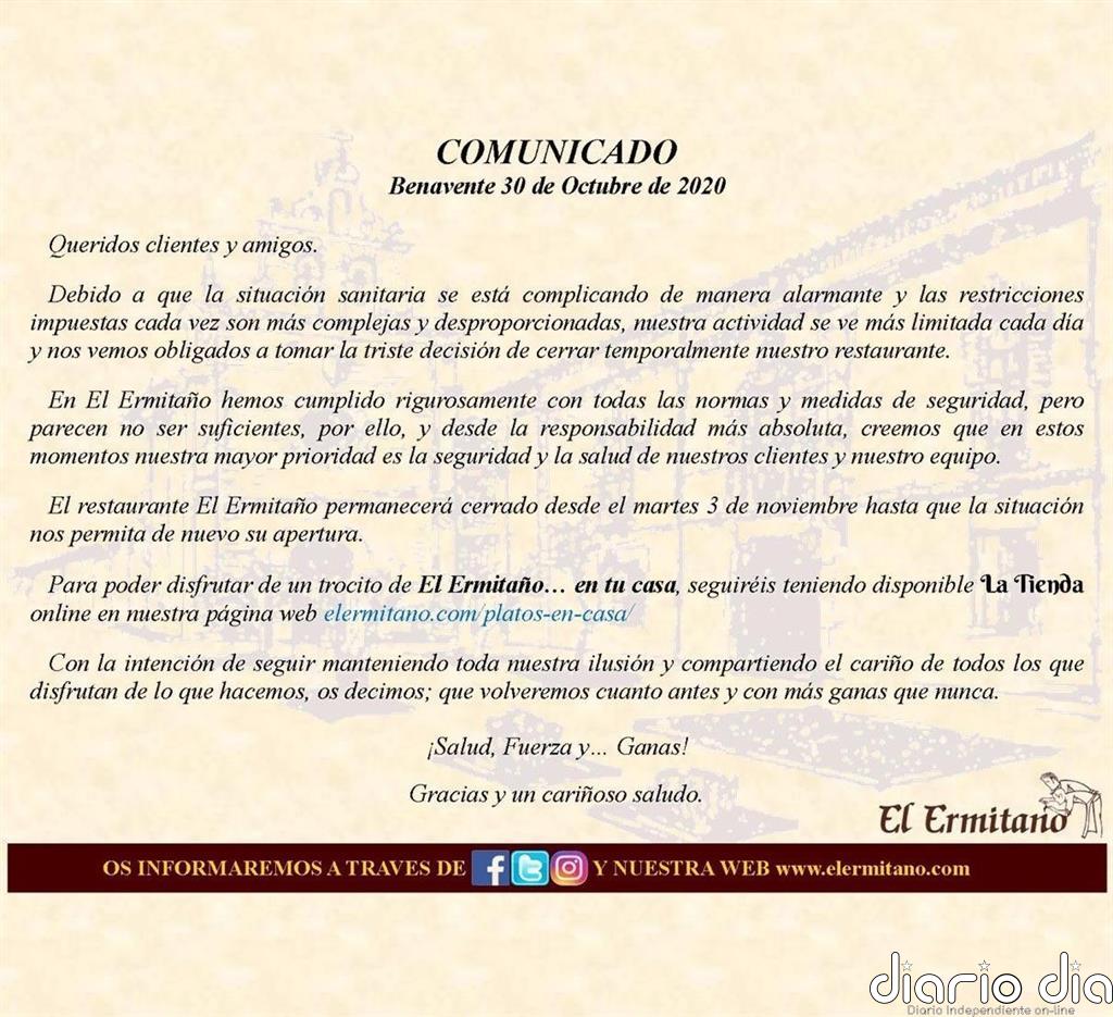El restaurante con una Estrella Michelin ‘El Ermitaño’, situado en Benavente (Zamora), ha anunciado que cerrará sus puertas desde este martes, 3 de noviembre hasta que «la situación permita de nuevo la apertura», ante las restricciones «cada vez más complejas y desproporcionadas» que limitan la actividad de la hostelería.