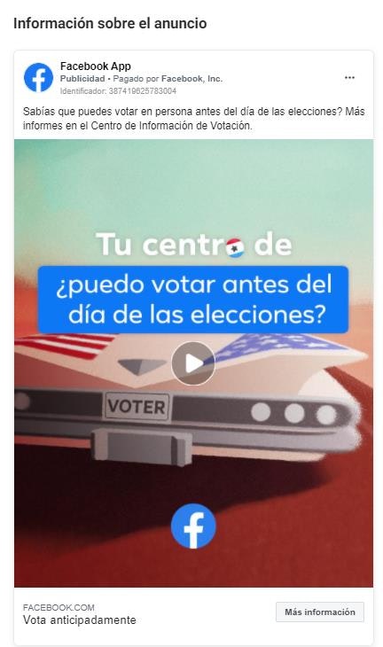 Sin embargo, en los últimos meses lo que más llama la atención no es la inversión que los equipos de campaña de Biden o Trump han hecho en Facebook sino que el propio Facebook, en los últimos 90 días, haya invertido más de 28 millones de dólares en anuncios orientados a movilizar la participación –además de más de 8 millones en Instagram–.