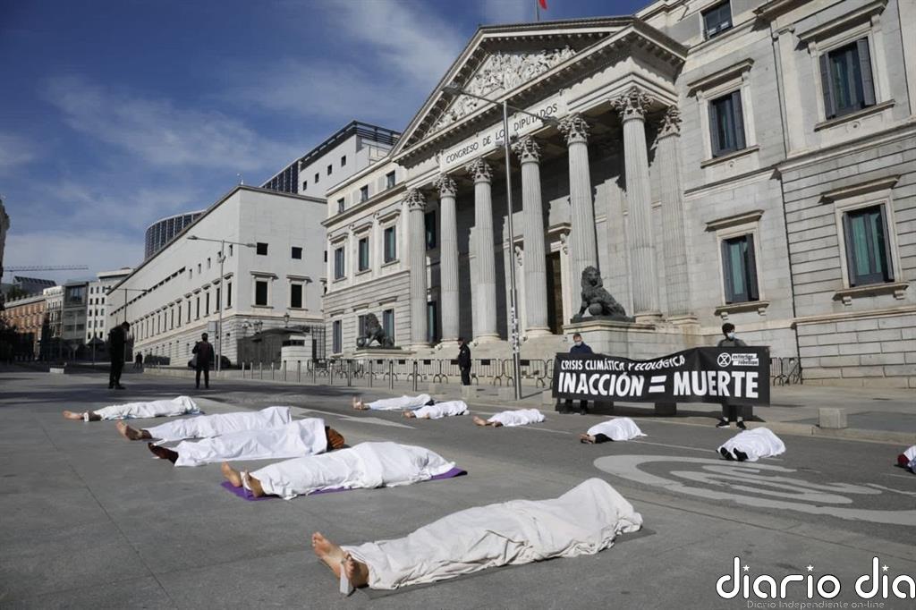 Activistas de Extinction Rebellion han cubierto este domingo la calzada frente al Congreso de los Diputados de ‘cadáveres’ para visibilizar las causas de muerte relacionados con la crisis climática.