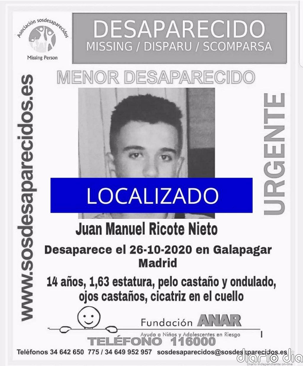 Juan Manuel Ricote Nieto, el adolescente de 14 años desaparecido en la localidad de Galapagar desde el 26 de octubre, ha sido hallado en buen estado de salud, ha informado este martes la asociación SOS Desaparecidos.