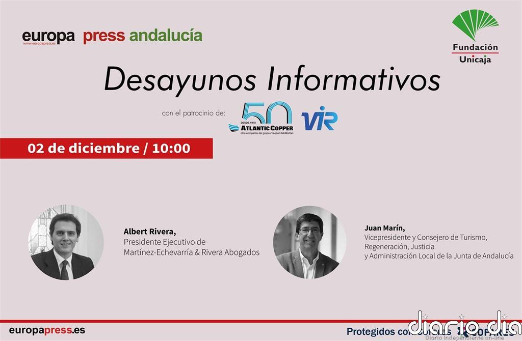 agencia Andalucía celebra el próximo miércoles 3 de diciembre, de la mano de la Fundación Unicaja y con el patrocinio de Atlantic Copper y Laboratorios Vir, una nueva edición de sus desayunos informativos en formato presencial con la participación del presidente ejecutivo de Martínez-Echevarría & Rivera Abogados y exlíder de Ciudadanos (Cs), Albert Rivera, y el vicepresidente de la Junta y consejero de Turismo, Regeneración, Justicia y Administración Local y coordinador de Cs en Andalucía, Juan Marín, en esta ocasión en un formato de diálogo moderado por el delegado de agencia Andalucía, Francisco Morón.