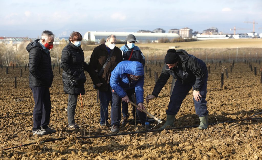 Participantes del programa ‘Envejecimiento activo’ de ANFAS plantan manzanos en la finca de prácticas de la UPNA