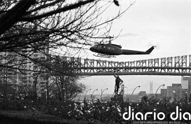 Imagen del helicóptero mientras el 13 de noviembre de 1974 se disponía a aterrizar en la sede de la ONU, trayendo al líder de la Organización de Liberación de Palestina (OLP), Yasser Arafat. Foto: Michos Tzovaras/ONU
