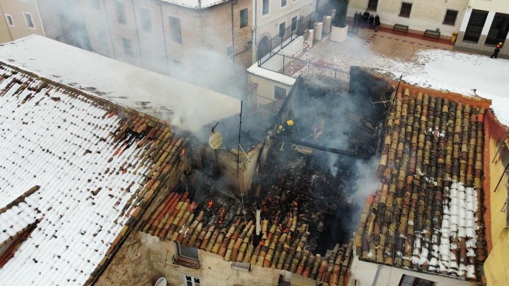 En torno a 15 horas duró este sábado la «laboriosa y complicada» intervención de extinción del incendio localizado en las inmediaciones del Almudí, concretamente en el número 6 de la calle Pósito pero que ha afectado también al número 8 y al propio Almudí, en parte del tejado aunque la cubierta ha quedado intacta.