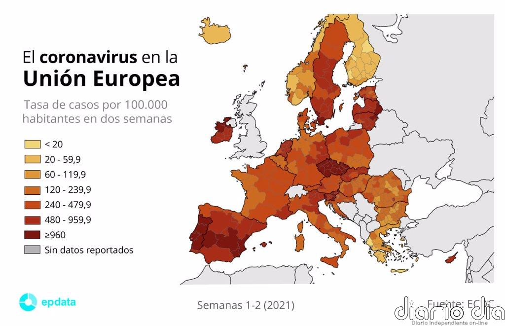 Según una recreación mostrada en la misma comparecencia por el comisario de Justicia, Didier Reynders, si se incorpora el cuarto color a la clasificación de riesgo que ya publica periódicamente el Centro Europeo para el Control y la Prevención de Enfermedades (ECDC) habrá una decena de países que ya tendrían parte de su territorio tintado de rojo oscuro, incluido todo el territorio de España.