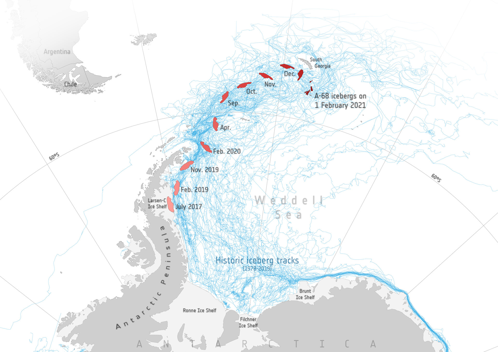 Las imágenes, capturadas por la flota de satélites Copernicus, han trazado el proceso del A-68A en su viaje a lo largo de los últimos tres años. Los últimos datos provenientes de la misión de radar Copernicus Sentinel-1 muestran que el iceberg sufrió más daños en 2021 cuando un nuevo iceberg se desprendió de la A-68A la semana pasada. La losa más pequeña, rápidamente nombrada A-68G por el Centro Nacional de Hielo de EE.UU., mide aproximadamente 53 km de longitud y alrededor de 18 km en su punto más ancho.