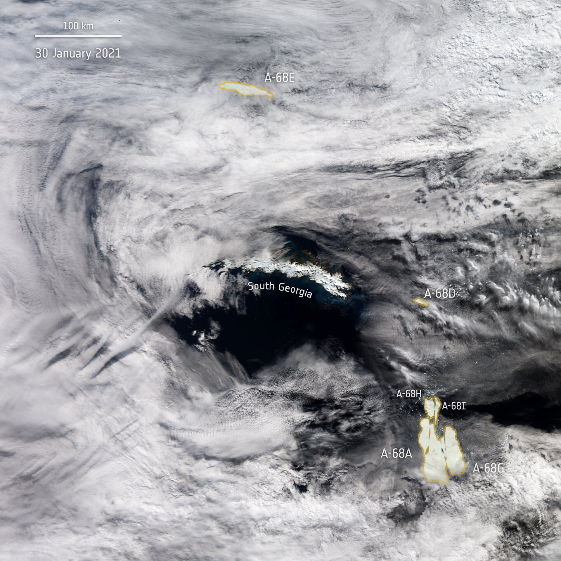 El iceberg principal A-68A, que alguna vez fue el más grande del mundo, ahora mide solo unos 60 km de largo con un ancho máximo de 22 km. El grupo colectivo de icebergs parece estar separándose, con la A-68H moviéndose hacia el norte, aproximadamente a 130 km de Georgia del Sur. El iceberg principal A-68A parece moverse hacia el sur y actualmente se encuentra a unos 225 km de Georgia del Sur. Este último evento de disgregación podría indicar que lo más probable es que los icebergs se alejen de la isla y ya no amenacen la vida silvestre de la isla.