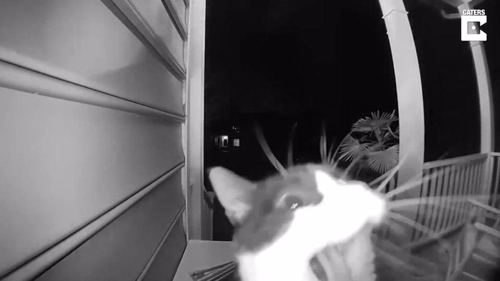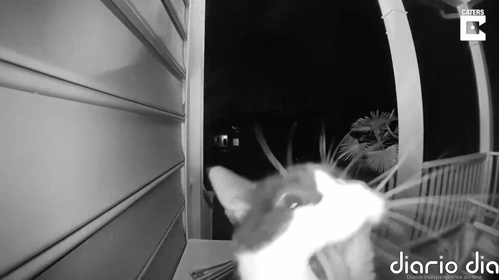 La cámara de vigilancia de la entrada de una casa capturó el momento en que un inteligente gato hace sonar el timbre con su pata para que le abran la puerta.