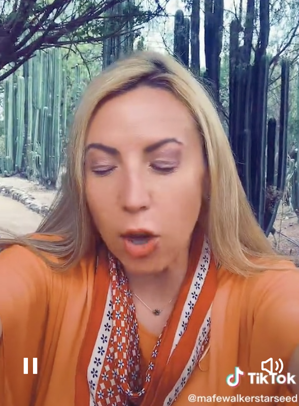 Mafe Walker es el nombre de esta mujer que suele grabarse videos en la antigua ciudad de Teotihuacán o en importantes lugares arqueológicos de México porque allí existe una frecuencia más alta porque ella lo que emana es “una frecuencia galáctica que yo emano a través de mis cuerdas vocales”, según ha explicado en este programa de la televisión mexicana.