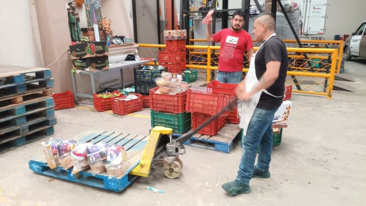 En el almacen del Banco de Morelos, el ruido de montacargas que acomodan grandes cajas de comida compite con el vocerío de los vendedores del mercado que ofrecen fruta y verdura. El movimiento más intenso ocurre en el segundo piso de una bodega de paredes blancas y alto techo de zinc, donde un grupo de trabajadores selecciona la comida y prepara los paquetes.