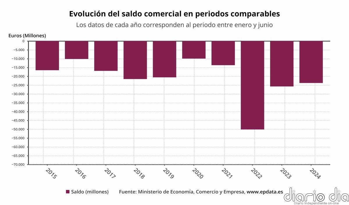 En cuanto a los datos solo del mes de agosto, el informe de Comercio refleja que el déficit comercial se situó en 4.763 millones de euros, lo que supone un incremento del 7,4% respecto a los 4.435,1 millones registrados en el mismo periodo de 2023.