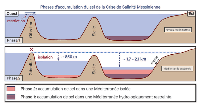 Gracias a un análisis de los isótopos de cloro contenidos en las sales extraídas del fondo del Mediterráneo, los científicos han rastreado las dos fases de esta desecación extrema. En una primera fase, que se prolongó unos 35.000 años, se depositaron sales en la parte oriental del Mediterráneo debido a una restricción parcial de su flujo hacia el Atlántico. Durante una segunda fase, más corta (menos de 10.000 años), las sales se acumularon en todo el Mediterráneo, provocando un rápido secado del mar, con un descenso del nivel del agua de 1,7 a 2,1 kilómetros en el Mediterráneo oriental y de unos 850 metros en su parte occidental. Así, la cuenca mediterránea perdió el 70% de su volumen de agua, acumulando un millón de kilómetros cúbicos de sal en su fondo.
