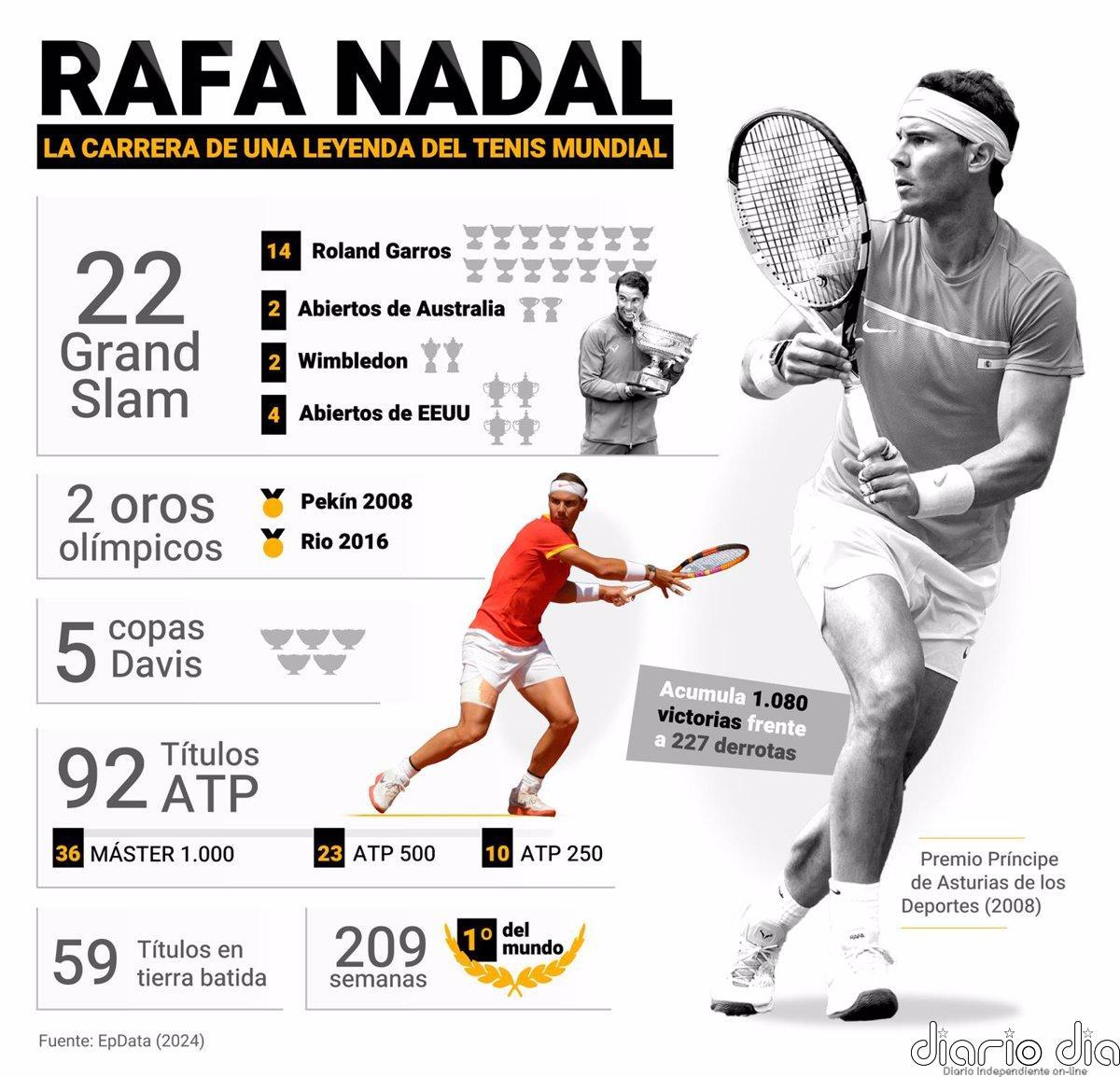El tenista de Manacor puso el punto y final a una carrera repleta de éxitos y que inició desde muy pronto, con apenas 17 años, momento en el que empezó a labrar un palmarés que le sitúa como seguramente uno de los mejores de la historia de este deporte, donde fue protagonista de una de sus mejores eras junto, principalmente, al suizo Roger Federer y el serbio Novak Djokovic, con los que formó un ‘Big 3’ de altos vuelos.