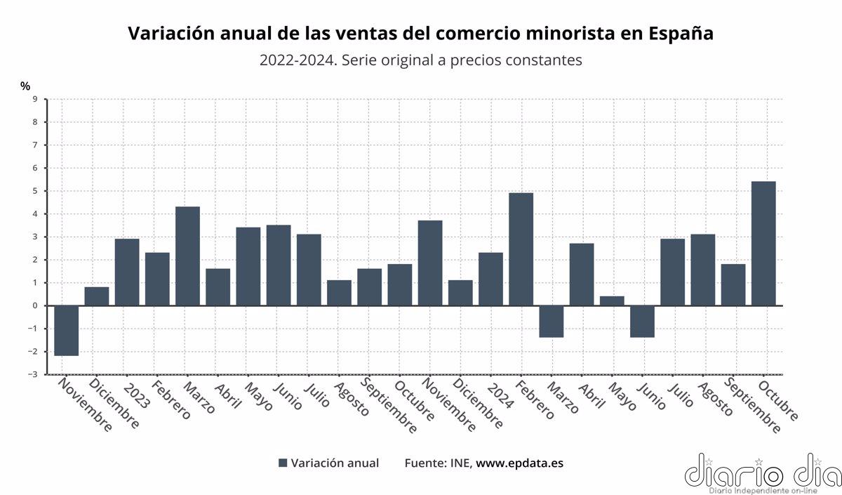 El comercio minorista registró en octubre un aumento de sus ventas del 5,4% en relación al mismo mes de 2023, tasa 3,6 puntos superior a la del mes anterior y la más elevada desde abril de 2022, según ha informado este viernes el Instituto Nacional de Estadística (INE).