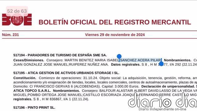 La asesora de Moncloa Pilar Sánchez Acera, implicada en la filtración sobre el novio de la presidenta de la Comunidad de Madrid, Isabel Díaz Ayuso, cesó como consejera de la empresa pública Paradores el 31 de octubre, una vez que Óscar López se convirtió en ministro de Transformación Digital.