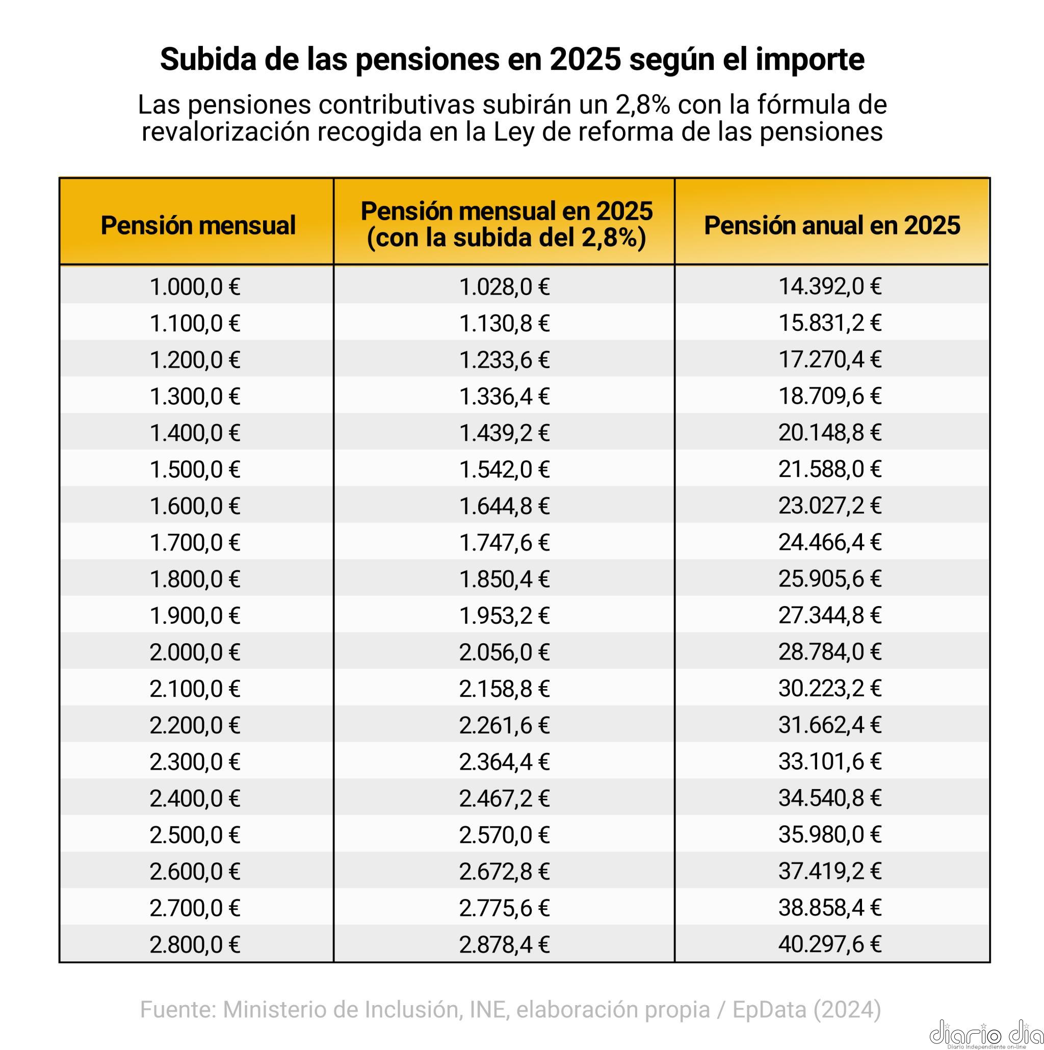 Las pensiones contributivas subirán en 2025 un 2,8% con la fórmula de revalorización recogida en la Ley de reforma de las pensiones en la que se tiene en cuenta, como referencia para determinar la subida de estas prestaciones, el IPC interanual promedio de doce meses (de diciembre del año anterior a noviembre del ejercicio en vigor).