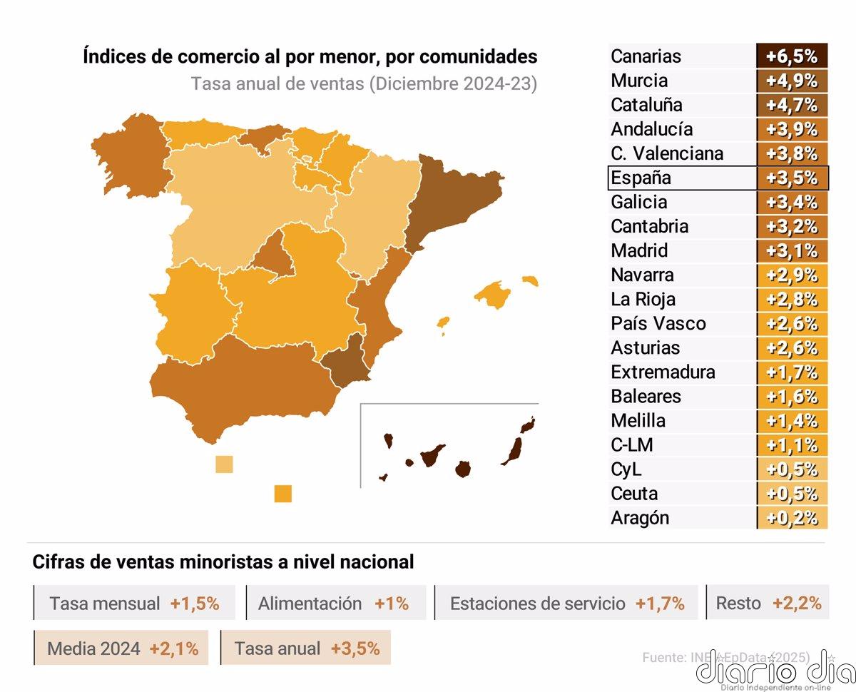 Las ventas del comercio minorista, sin incluir las estaciones de servicio, subieron en 2024 un 2,1% en comparación con 2023, mientras que las ventas en estaciones de servicio subieron un 2%.
