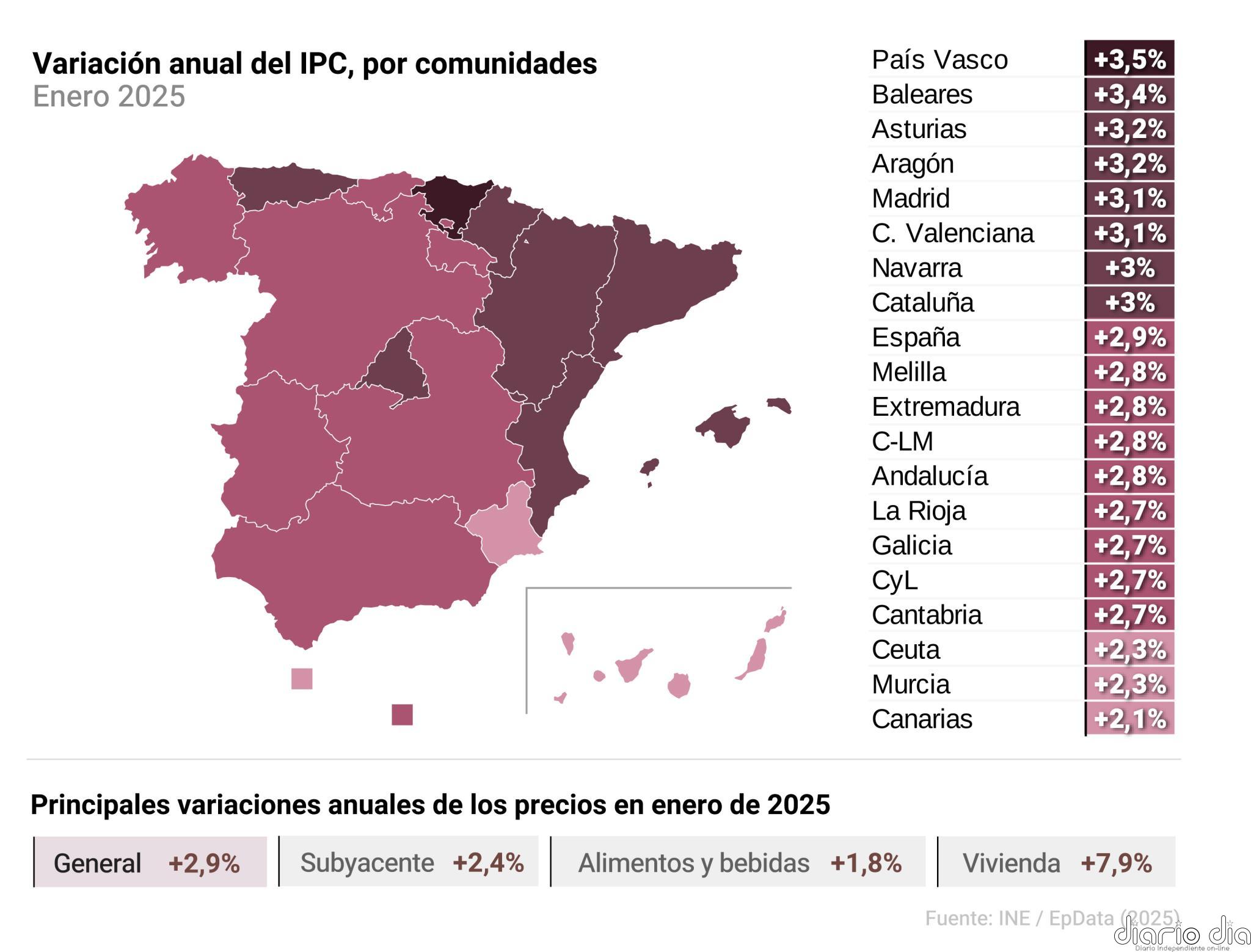 Por su parte, las ciudades autónomas de Ceuta y Melilla registraron al finalizar enero un IPC del 2,3% y del 2,8%, respectivamente.