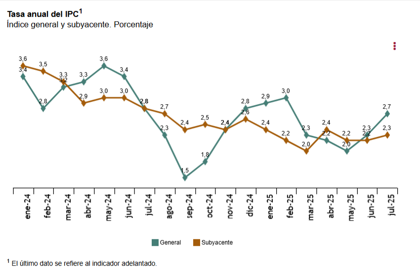 Por su parte, la inflación subyacente —que excluye los alimentos no elaborados y los productos energéticos— se estima en el 2,3%, una décima más que en junio.