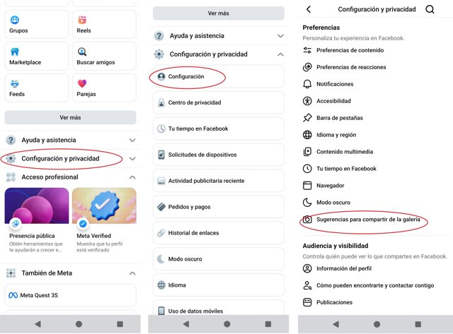 Estas dos opciones, que aparecen activadas por defecto, se encuentran recogidas en una nueva pestaña que se denomina ‘Sugerencias para compartir de la galería’, y reciben el nombre de ‘Sugerencias personalizadas para compartir de la galería’ y ‘Ver sugerencias de la galería al explorar Facebook’.