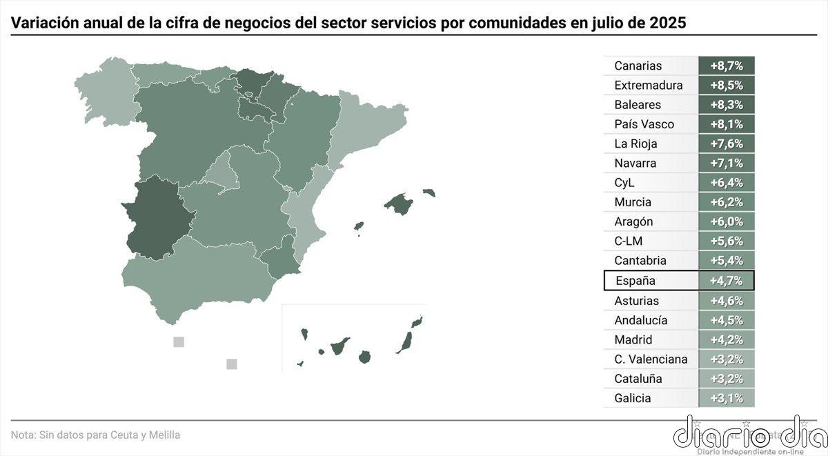 Todas las comunidades autónomas elevaron la cifra de negocios del sector servicios en julio de este año en relación al mismo mes de 2024.