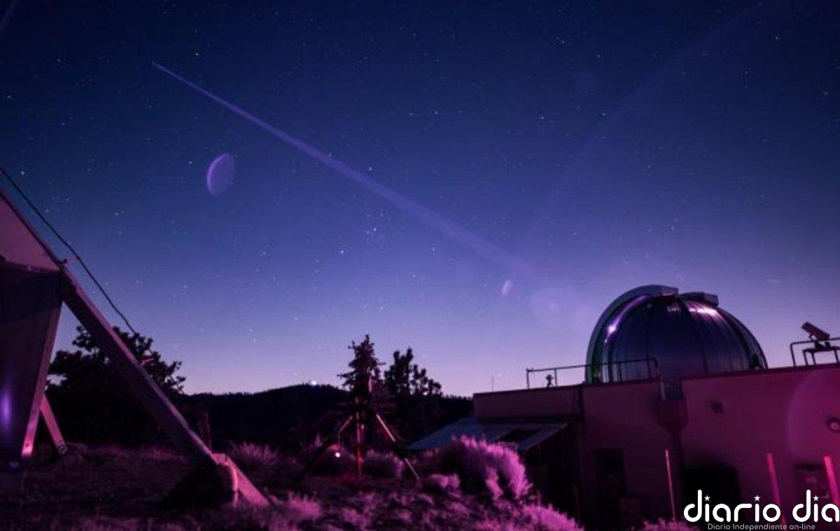 En esta fotografía infrarroja, el Laboratorio del Telescopio de Comunicaciones Ópticas (OCTL), ubicado en las instalaciones de Table Mountain del Laboratorio de Propulsión a Chorro, emite su radiofaro de ocho láseres (con una potencia total de 1,4 kilovatios) al transceptor láser de vuelo de Comunicaciones Ópticas del Espacio Profundo (DSOC) a bordo de la nave espacial Psyche de la NASA.