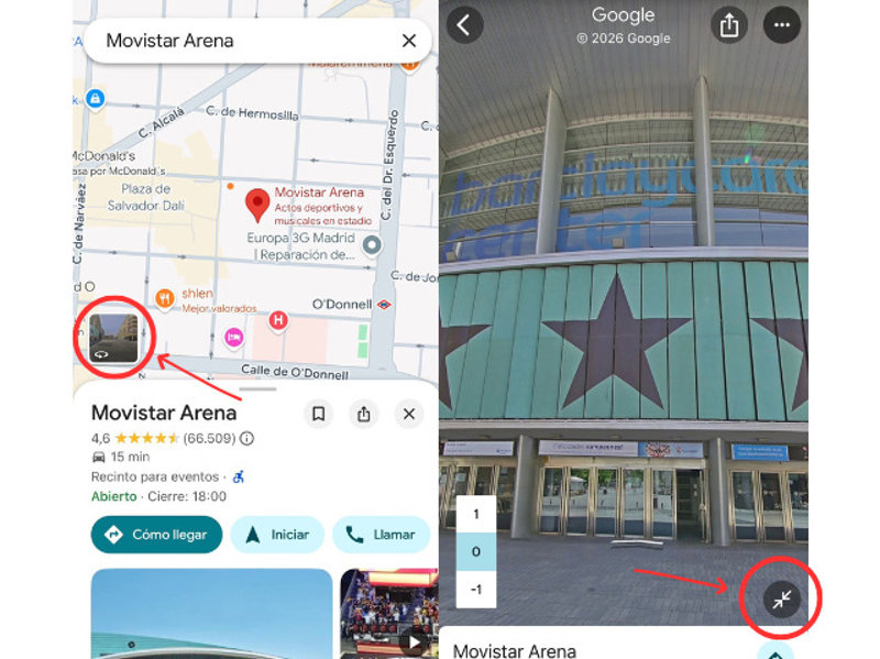 Una vez que esté la pantalla completa basta con pulsar en las flechas que aparecen en la esquina inferior derecha para reducir el tamaño y así se dividirá la pantalla. En la parte superior se verá la vista de Street View con las flechas de orientación y en la inferior Google Maps con las calles marcadas en azul.
