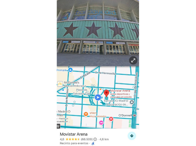 En primer lugar, busca el destino en Google Maps. Se abrirá el panel de resultados con el nombre, reseñas, cómo llegar, etc. En un pequeño cuadrado encima aparecerá una imagen de Street View. Si pinchas en ella se activará esta herramienta a pantalla completa.