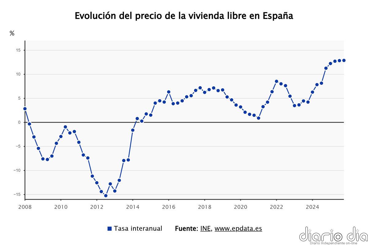 En el cuarto trimestre de 2025, el precio de la vivienda libre subió un 12,9% respecto al mismo periodo del año anterior, una décima más que en el trimestre previo y su tasa más elevada desde el primer trimestre de 2007, cuando se superó el 13% de incremento.