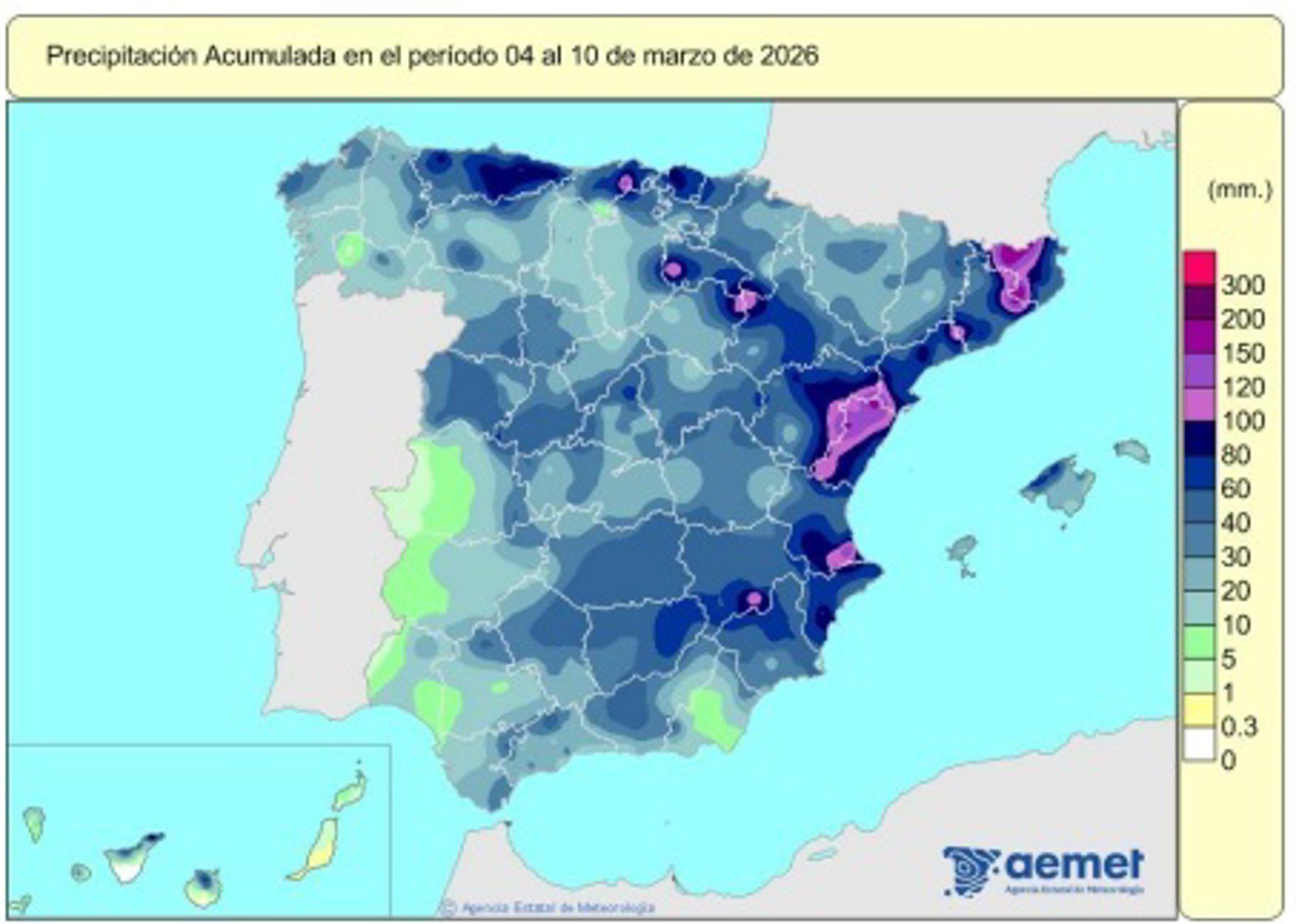 Durante el periodo comprendido entre el 4 y el 10 de marzo, AEMET indica que las las precipitaciones fueron abundantes y afectaron a todo el territorio. Según explica, las más destacadas se registraron en la mitad este peninsular, con acumulaciones que superaron los 100 l/m2 en amplias zonas del levante, como Castellón, y en Cataluña, en el sistema Ibérico y, de manera más aislada, en el sur de Valencia y de Albacete, así como en el interior de Cantabria.