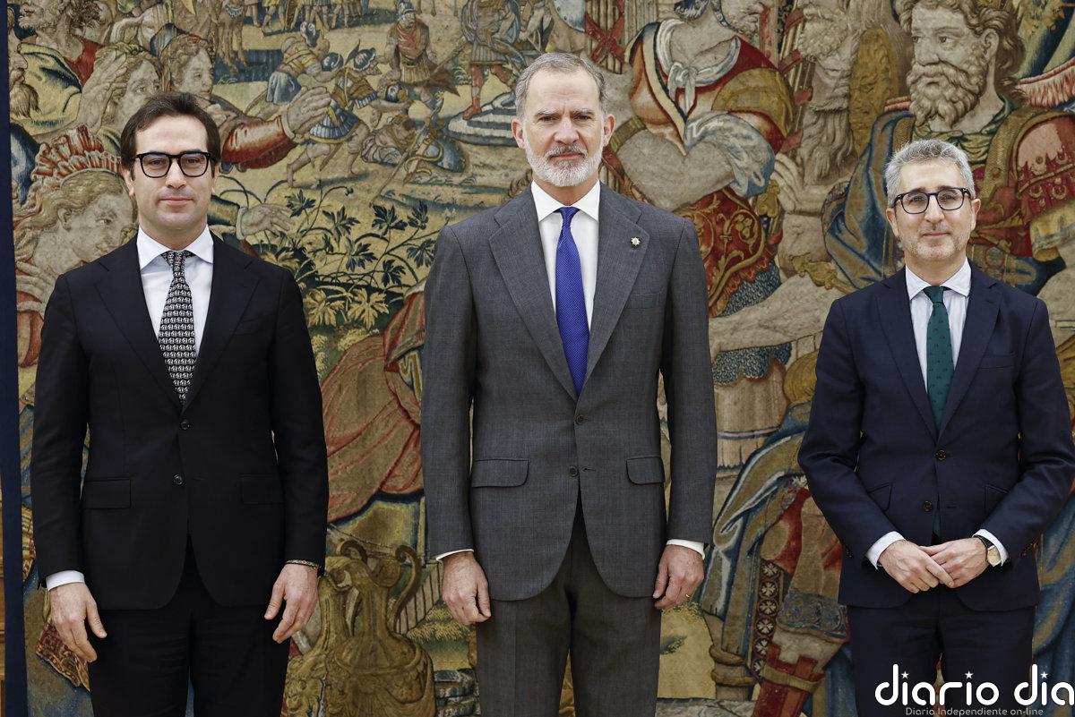 El vicepresidente primero del Gobierno y ministro de Economía, Comercio y Empresa, Carlos Cuerpo, y el nuevo titular de Hacienda, Arcadi España, han prometido sus cargos ante el rey Felipe VI en el Palacio de la Zarzuela.