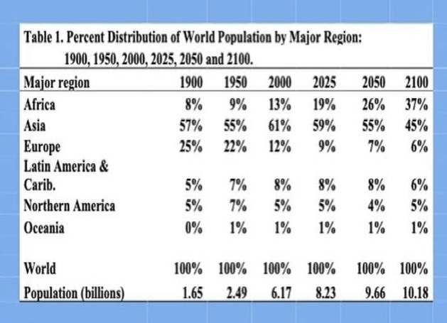 Resultan particularmente notables los cambios en la proporción de la población mundial que reside en África y Europa. A principios del siglo XX, la proporción de la población mundial que vivía en África y Europa era de 8 % y 25 %, respectivamente. Para finales del siglo XXI, se proyecta que estas proporciones alcancen 37 % en África y 6 % en Europa (Tabla 1).