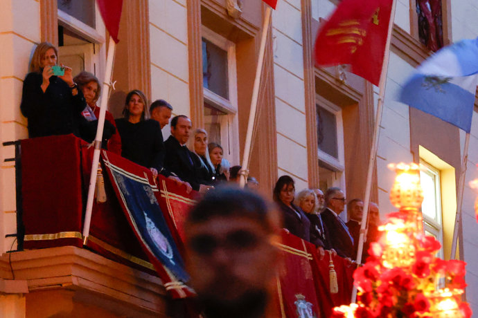 Desde uno de los balcones del Ayuntamiento, y con el único alumbrado de los pasos de la procesión, doña Cristina ha captado con su teléfono móvil la talla realizada en 1958. A su lado, la reina emérita y su hija mayor no han perdido detalle de la procesión, guardando el respetuoso silencio que reinaba en las calles de la ciudad murciana.